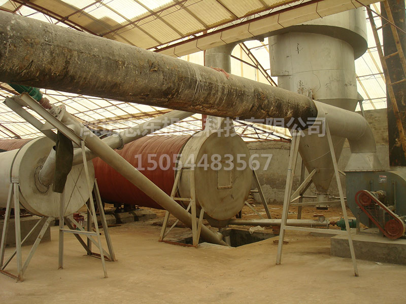 鋸末烘干機:包括熱風(fēng)爐、進料口、旋轉(zhuǎn)筒、過濾筒、物料輸送管、冷卻筒和出料口;其中旋轉(zhuǎn)筒位于主動滾輪上,主動滾輪靠電機及減速傳動帶動旋轉(zhuǎn)筒低速轉(zhuǎn)動,生熱爐與旋轉(zhuǎn)筒之間設(shè)有進料口,旋轉(zhuǎn)筒內(nèi)設(shè)有翻炒葉片,在旋轉(zhuǎn)筒與過濾筒相連處設(shè)有擋板,擋板上開有一小孔,過濾筒一端與旋轉(zhuǎn)筒相連,另一端與物料輸送管相連,過濾筒內(nèi)設(shè)有擋塊,過濾筒的底部設(shè)有排渣孔,冷卻筒一端通過鼓風(fēng)機與物料輸送管相連,另一端與出料口相連。由于采用上述結(jié)構(gòu),所以鋸末能在旋轉(zhuǎn)筒內(nèi)充分干燥,且鋸末在進入物料輸送管前再次充分散開,使水分蒸發(fā)快,擋塊可將鋸末中的雜質(zhì)擋住,###進入物料輸送管中鋸末的質(zhì)量。鋸末進入鋸末烘干機內(nèi)由噴吹管與回轉(zhuǎn)筒體共同作用,在筒內(nèi)沸騰流化,熱風(fēng)與物料充分觸,完成干燥。